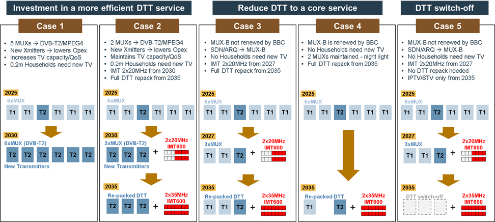 The report examined five potential evolution cases for Digital Terrestrial Television (DTT), ranging from continued investment in a more efficient DTT network to a complete switch-off and reallocation of spectrum for mobile broadband in the 600 MHz band (often termed IMT600). It evaluated these scenarios primarily through the lens of spectrum efficiency, network costs, coexistence with Programme Making and Special Events (PMSE) services, and implications for mobile network operators. While the analysis acknowledges the potential transition to Internet Protocol Television (IPTV) as a long-term scenario (Case 5 in the chart below), we did not undertake a detailed examination of the technical, operational, or socio-economic challenges associated with such a transition. Instead, the focus was on spectrum planning, reconfiguration costs, and the technical feasibility of various DTT evolution pathways.